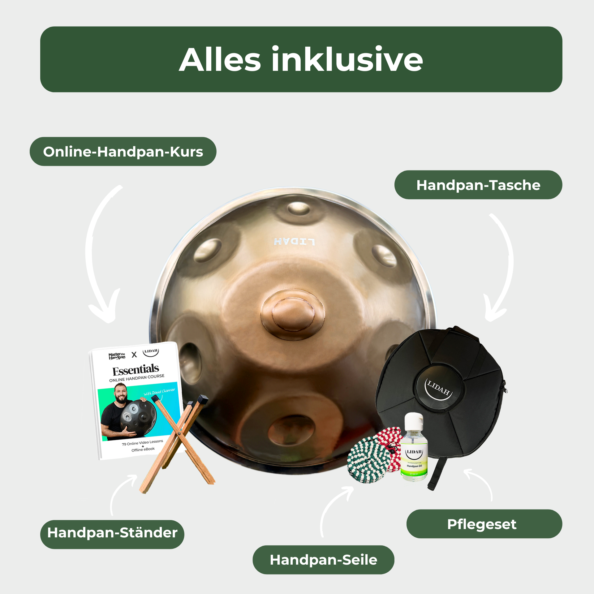 - Kostenloser lebenslanger Zugriff auf „Master the Handpan“ (über 70 Online-Lektionen)